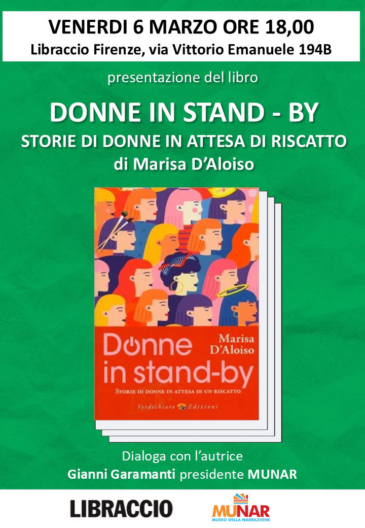 Venerdì 6 marzo alle ore 18, alla libreria Libraccio-Dalmazia, Gianni Garamanti del Museo della Narrazione presenta il libro di Marisa D’Aloiso “Donne in stand-by. Storie di donne in attesa di un riscatto” (2025, Verdechiaro).