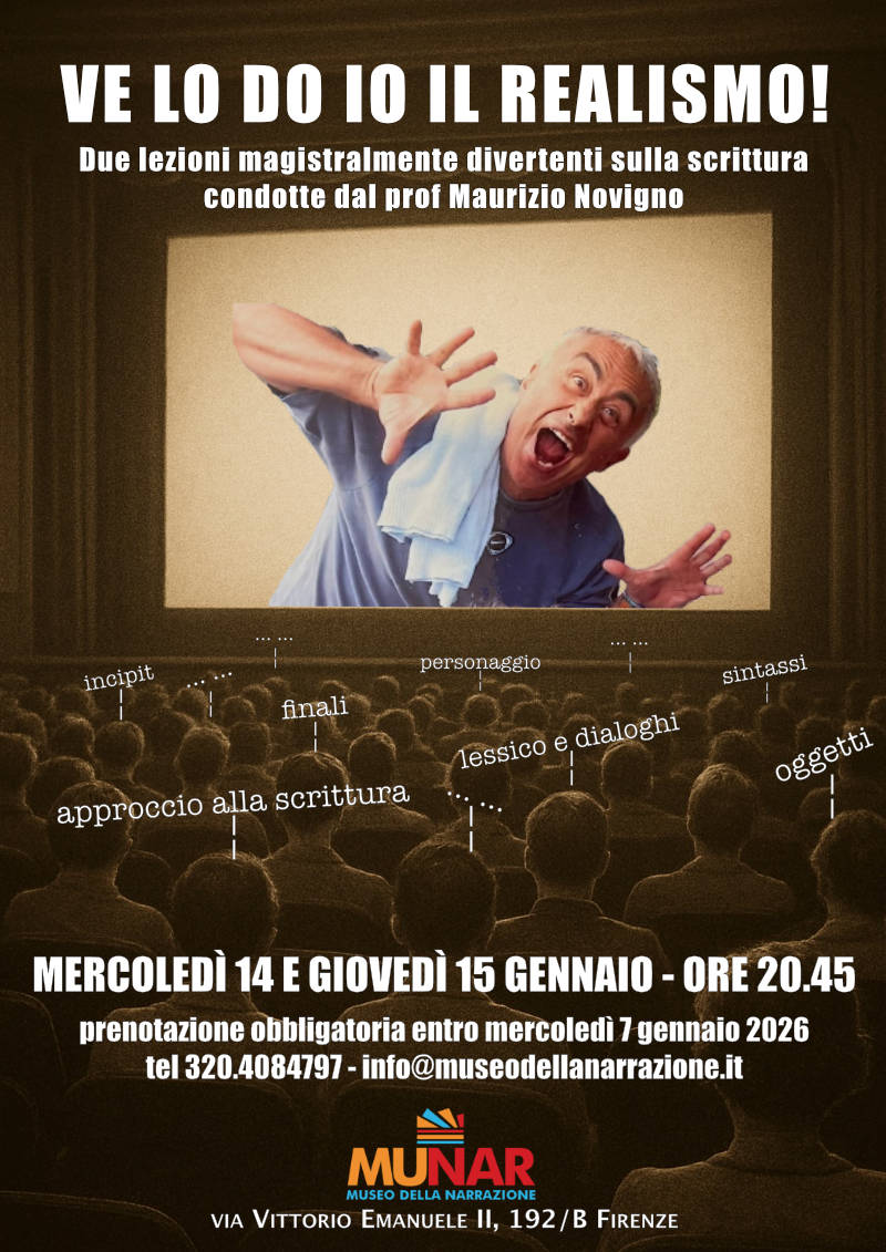 Mercoledì 14 e giovedì 15 gennaio 2026, alle 20.45 al MUNAR due lezioni magistralmente divertenti condotte dal prof (pentito) Maurizio Novigno sulla scrittura realista.